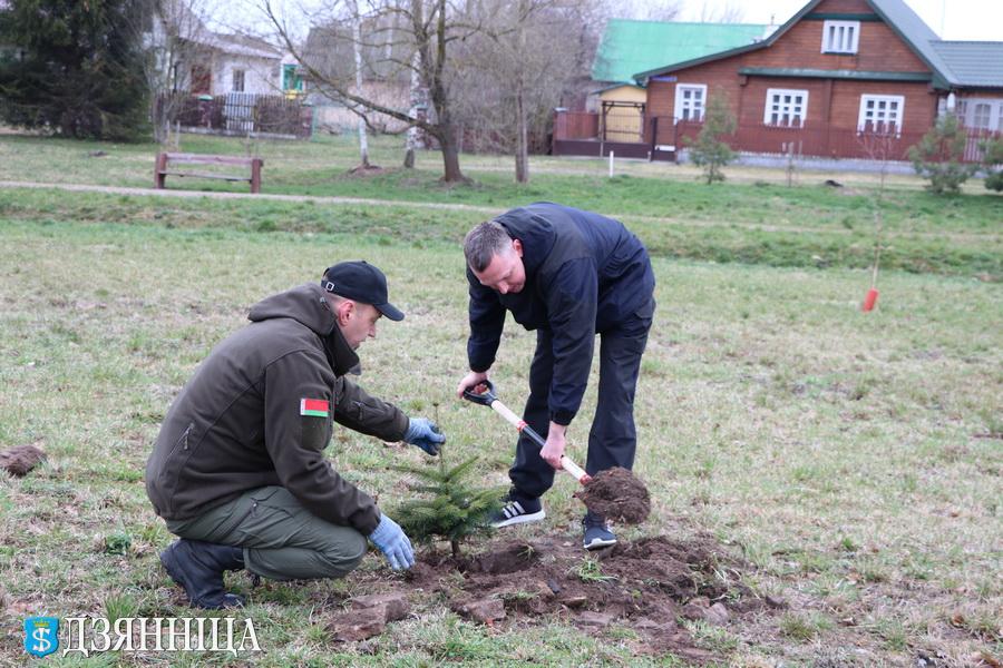 А вот старший инспектор по административной практике ОГАИ Дмитрий Жагунь пришёл на субботник не с пустыми руками. Его жена Татьяна решила подарить отделу голубую ель. Дмитрий вместе с сынишкой Максимом и посадили возле здания РОВД красивое молоденькое деревце.