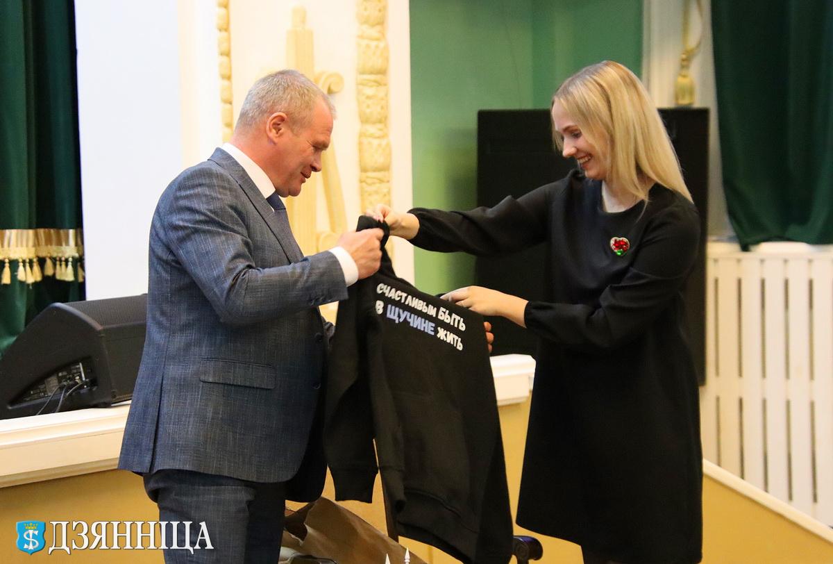Напрыканцы сустрэчы моладзь прэзентавала Аляксею Садоўскаму падарунак – байку з красамоўным надпісам “Шчаслівым быць у Шчучыне жыць”, а малады спецыяліст Наталія Сямашка парадавала прысутных вакальным выступам.