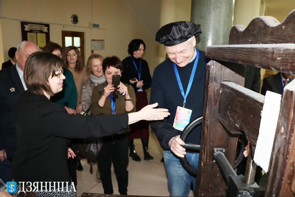 Знакомство с гимназией началось уже при входе, где гостей встречали юные барабанщицы. Не ожидали участники делегации, что во время интерактивной экскурсии у некоторых из них появится шанс перевоплотиться в образ белорусского первопечатника Франциска Скорины, чтобы попробовать печатать на самом настоящем станке. С интересом познакомились гости и с экспонатами музея "История образования Щучинщины".