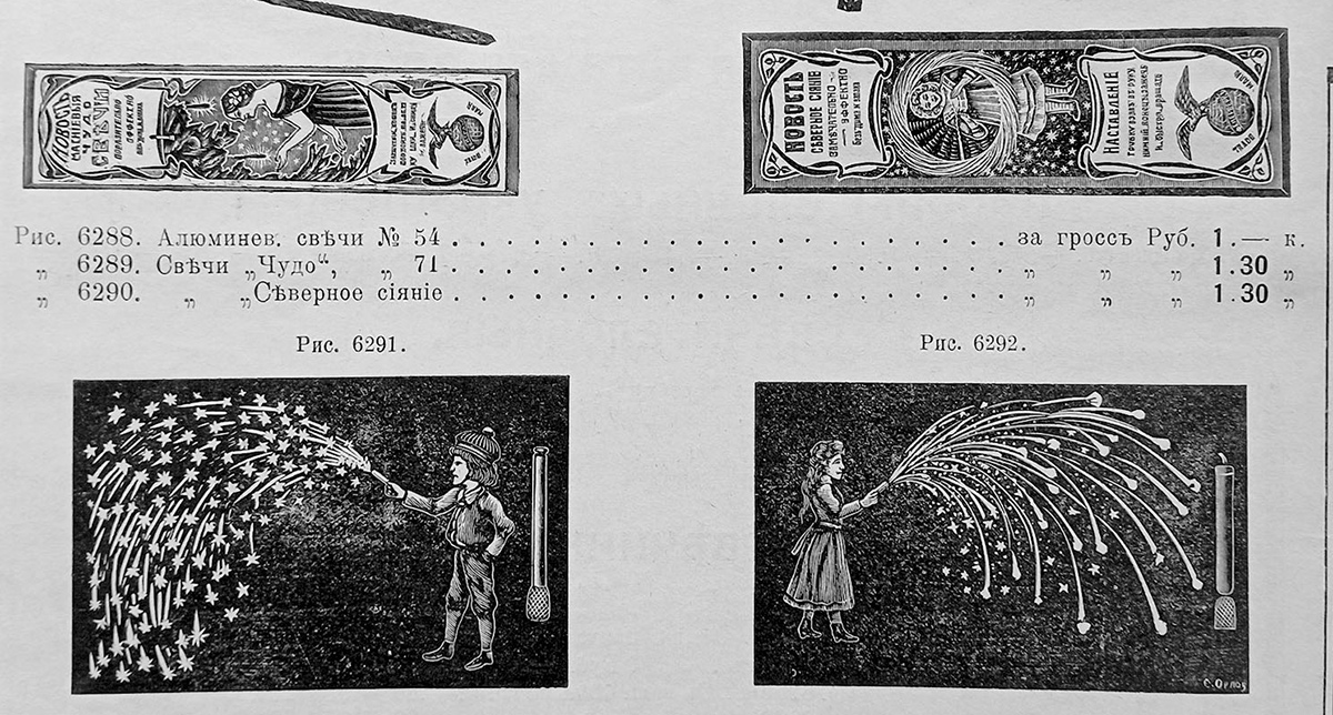 Для полноты создания праздничной картины в каталоге можно было заказать елочные хлопушки по безумно высокой цене — аж до 62 рублей 40 копеек за дюжину, гирлянды по два — два с половиной рубля, зажигательные нити для фейерверков по 1,30 рубля и прочие развлекательные аксессуары.