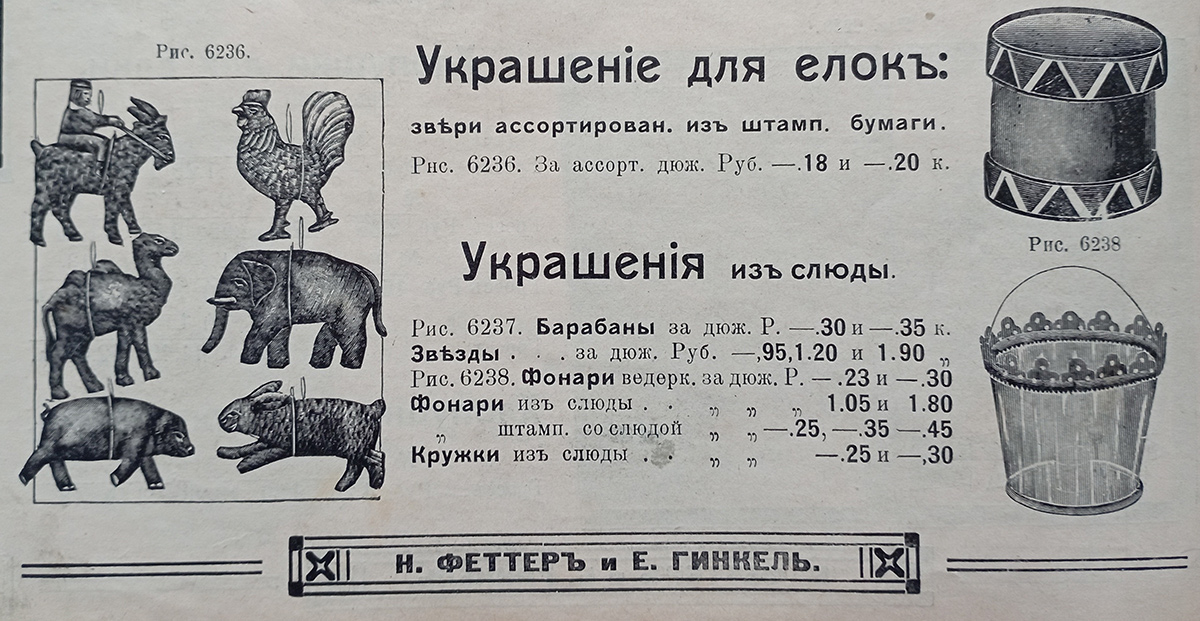 Основным поставщиком игрушек, петард, фейерверков, а также прочих украшений и аксессуаров для минчан и состоятельных граждан из других городов и весей стал минский торговый дом Ильи Каплана. Большая часть новогоднего ассортимента поставлялась из Москвы акционерным обществом Н. Феттера и Е. Гинкеля, имевшим — уже тогда! — собственный каталог, разнообразие торговых позиций в котором потрясет даже современных шопоголиков. В частности, в каталоге за 1910 год можно было найти совершенно шикарные образцы елочных украшений. Стеклянные шары самых причудливых форм и расцветок (цены здесь и ниже, разумеется, оптовые — в розницу изделия обычно продавались с наценкой 50 процентов и более) — от 20 копеек до двух с половиной рублей за дюжину. Стоимость набора доходила до 25 рублей.