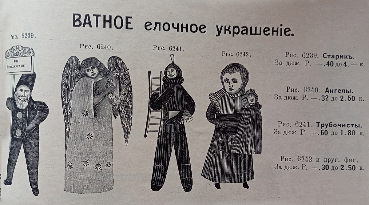 Были в каталоге Феттера-Гинкеля игрушки и подешевле — ватные и картонные. Ватные котировались по цене до полутора рублей за дюжину, картонные (их еще называли «дрезденский картонаж» — техника, когда фигурки склеивались из двух половинок тисненого картона, тонированного золотой или серебряной краской) и того дешевле — не дороже рубля за дюжину.