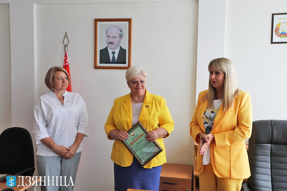 Елена Васильевна вручила Почетную грамоту райисполкома ведущему референту управления учёта налогов инспекции Ирине Рацкевич за многолетний добросовестный труд в системе налоговых органов, образцовое выполнение служебных обязанностей.