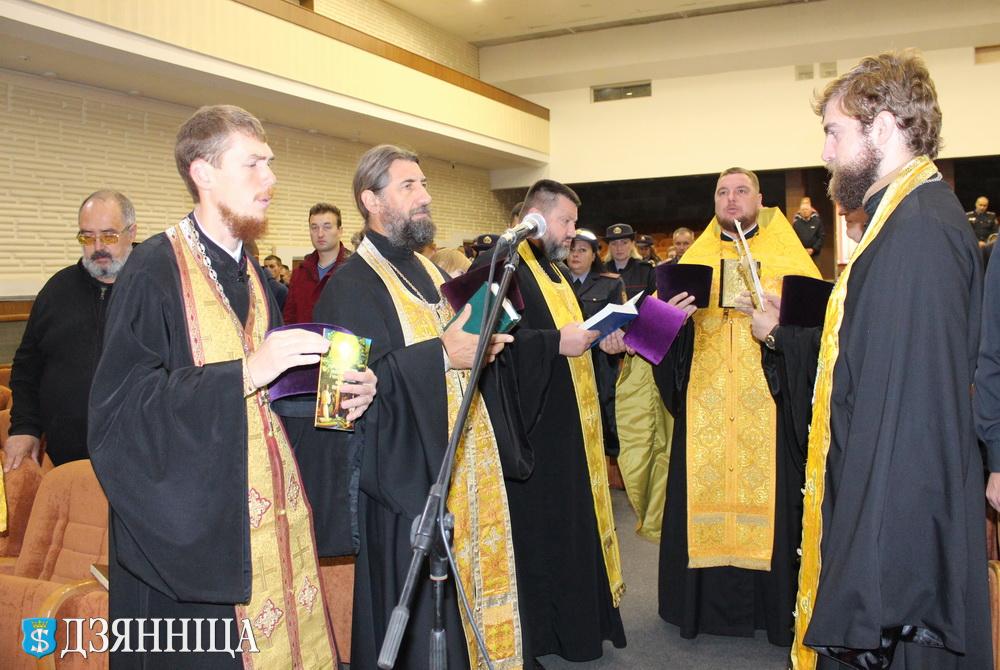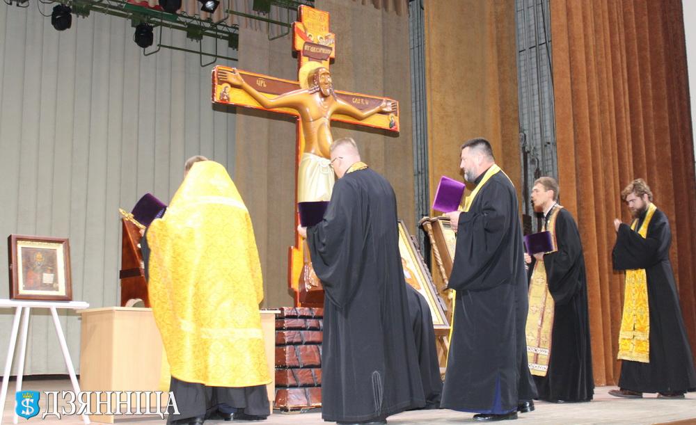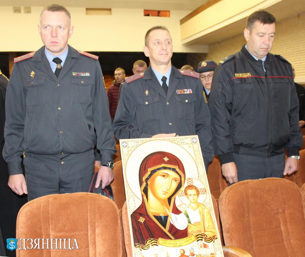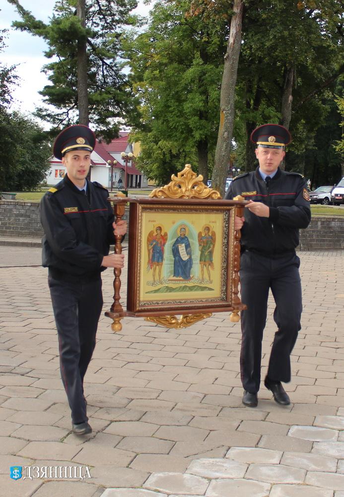 Вместе с прибывшими издалека святынями своё достойное и почитаемое место заняла и наша местная – Жировичская икона Божией Матери. Историю её явления рассказал клирик храма Богоявления Игорь Колосовский. Затем все присутствующие помолились Господу перед его Честным Животворным Крестом и Богородице – перед её иконами. В молебне приняли участие все священнослужители Щучинского благочиния. Люди возносили молитвы о мире, здравии, благоденствии в своих семьях и на родной белорусской земле. Все желающие имели возможность приложиться к святыням. В завершении церемонии священнослужители окропили правоохранителей святой водой. Были также освящены кабинеты и транспорт Щучинского РОВД.