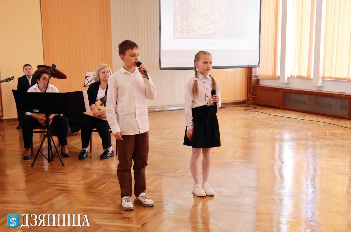 Ведущий мероприятия Арсений Сехович трогательно, искренне озвучил фрагменты из военных воспоминаний Михаила Савицкого, познакомил с непростой биографией художника. В рамках мероприятия эмоционально прозвучали стихотворения о войне в исполнении чтецов театрального и художественного отделений Софии Трахимчик, Егора Гаврона, Дарьи Макей и Дарьи Шандрохи. Под произведения народного оркестра народных инструментов Щучинской ДШИ все участники окунулись в музыкальный мир военных лет. Хор «Прима» исполнил песню «О той войне», а учащиеся хореографического отделения – постановку «Наша сэрца б’ецца».