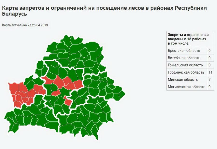 Из-за повышенного уровня пожарной опасности с 25 апреля закрыты все леса в Гродненском, Берестовицком, Свислочском, Волковысском, Мостовском, Зельвенском, Щучинском, Слонимском, Дятловском, Кореличском, Новогрудском районах. Открытыми для посещения на данный момент остаются лесные угодия Вороновского, Ошмянского, Островецкого, Сморгонского, Ивьевского и Лидского районов.