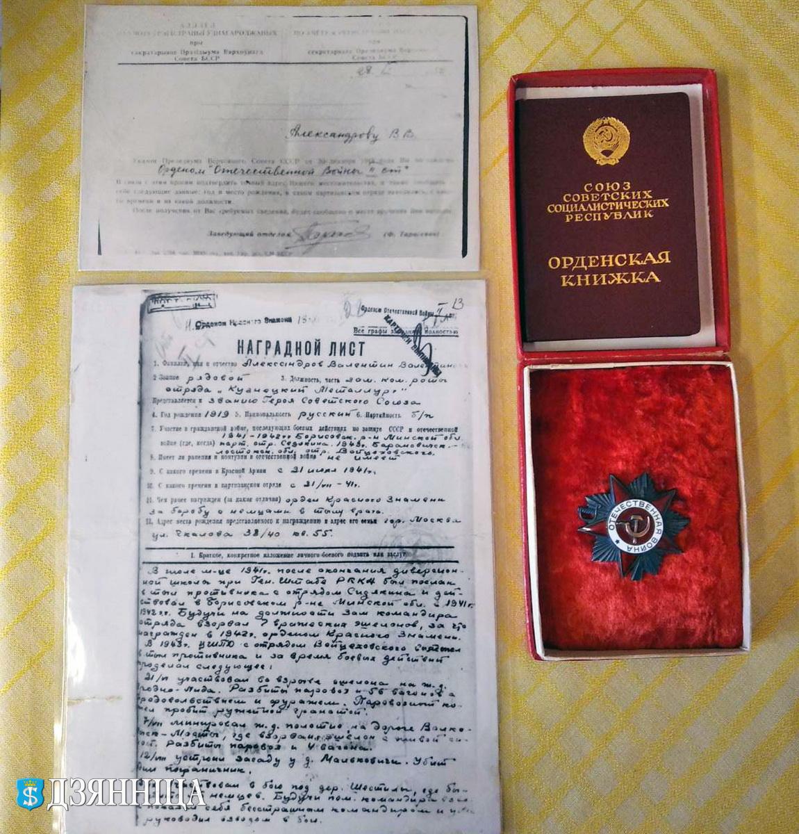 Из переписки берштовских краеведов было понятно , что с передачей ордена Александрова не спешили. Из письма Валентине Александровой: “Награду вашего брата нам пока не передали. Мы написали повторный запрос. Нам прислали фотокопию второго наградного листа на Валентина Валентиновича (посмертно). Оказывается, командование представляло его к званию Героя Советского Союза, но наградили орденом Отечественной войны.”
