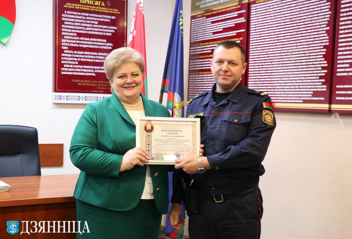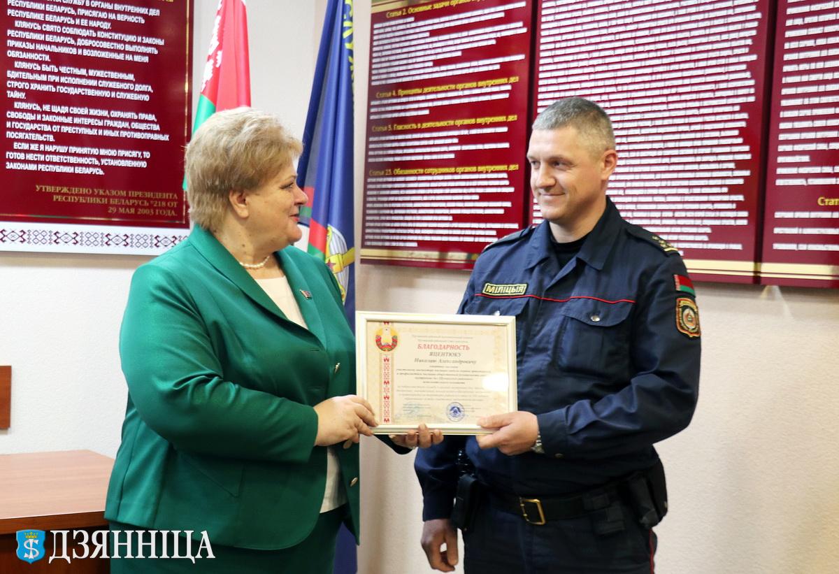 Анна Станиславовна вручила Благодарности Щучинского райисполкома и районного Совета депутатов старшим участковым инспекторам милиции – подполковнику милиции Дмитрию Богословскому, майору милиции Андрею Саковичу, майору милиции Николаю Станиславичу, страшему оперативному дежурному ОДС капитану милиции Дмитрию Рамейка, а также участковым инспекторам милиции – капитану милиции Валерию Сорока, капитану милиции Андрею Шершеню, капитану милиции Николаю Яцентюку. Благодарности также получили старший прапорщик милиции помощник дежурного ОДС Валерий Сорока, старший сержант милиции милиционер-водитель ОДС Никита Габис и старший сержант милиции младший участковый инспектор милиции Екатерина Кощей.