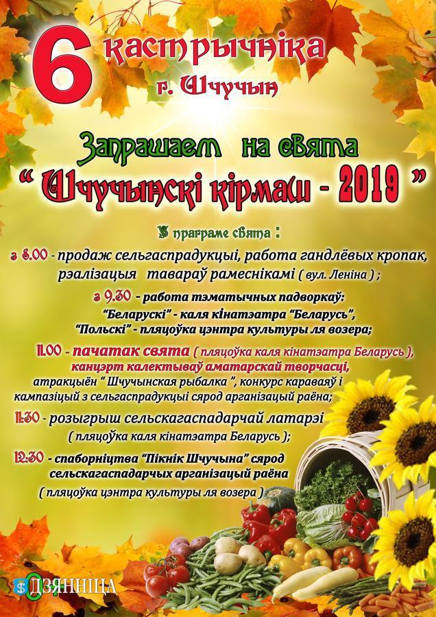 Заявления на участие в празднике от производителей (предприятий, индивидуальных предприниматлей, фермерсхих хозяйств, физических лиц) сельскохозяйственной продукции, продовольственных и непродовольственных товаров принимаются до 1 октября 2018 г. по адресу: город Щучин, площадь Свободы, 11, кабинет 32. За дополнительной информацией обращаться по телефону 23117.