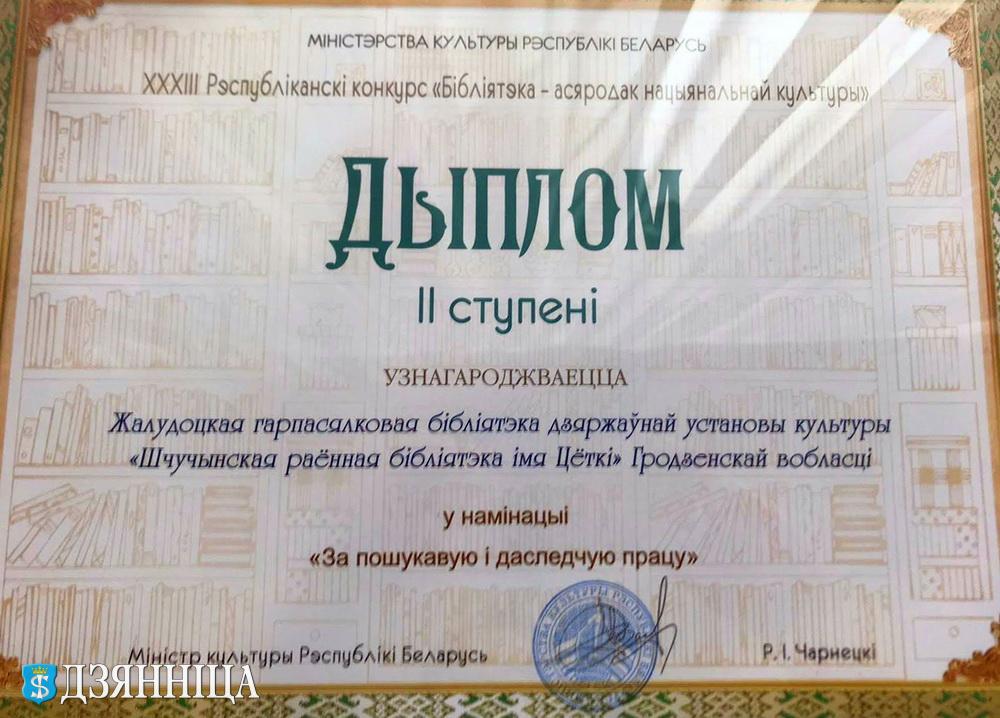 Па выніках гэтай працы філіял «Жалудоцкая гарпасялковая бібліятэка» быў адзначаны дыпломам II ступені у намінацыі «За пошукавую і даследчую дзенайсць».
