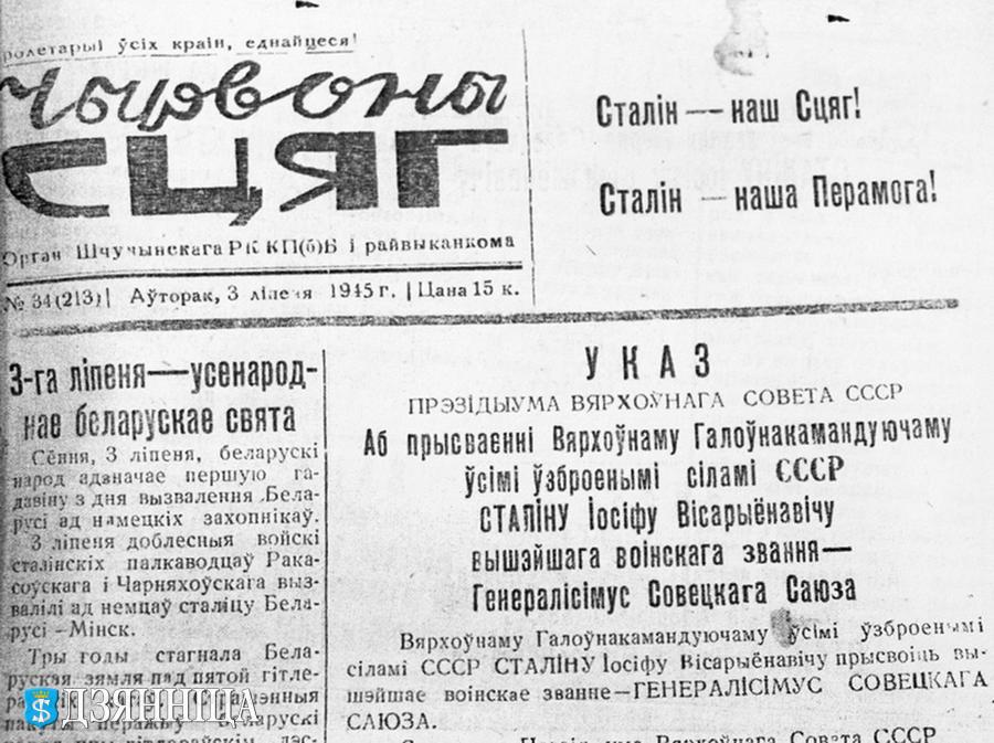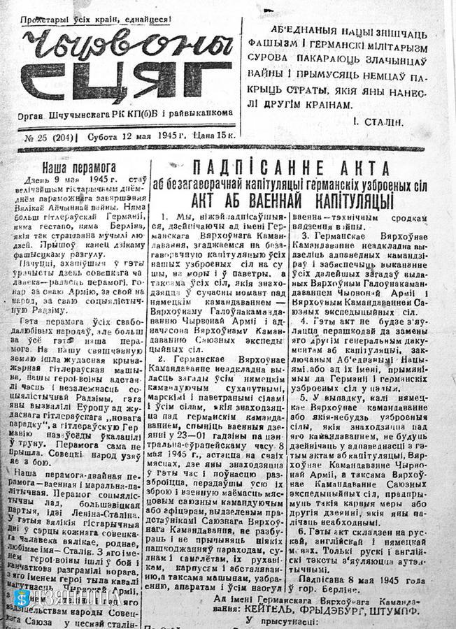 Большая частка першай паласы выпуску №25 ад 12 мая 1945 года прысвечана падпісанню акта аб безагаворачнай капітуляцыі германскіх узброеных сілаў. Пасля атрымання звестак аб пераможным завяршэнні Вялікай Айчыннай вайны працоўныя Шчучынскага раёна з энтузіязмам працягваюць падпіску на 4-ю Дзяржаўную Ваенную пазыку і значную суму аплачваюць наяўнымі грашыма. Раніцай 9 мая па сельсаветах адбыліся мнагалюдныя мітынгі. Нельга перадаць пачуццё вялікай радасці, якое ахапіла сэрца кожнага савецкага чалавека. Людзі цалаваліся, віншавалі адзін аднаго з найвялікшым святам Перамогі. Глыбока ў сэрцы трымаў кожны шчырую падзяку Чырвонай Арміі-вызваліцельніцы і вялікаму Сталіну, які прывёў народ да перамогі.