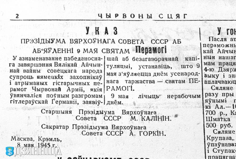 У гэтым жа нумары друкаваўся Указ Прэзідыума Вярхоўнага Савета СССР “Аб аб’яўленні 9 мая Святам Перамогі”, якое лічыць нерабочым днём. Водбліск Перамогі быў бачны і ў многіх наступных нумарах раённай газеты. Яна заклікала жыхароў раёна падмацоўваць ваенныя поспехі перамогамі на працоўным фронце.