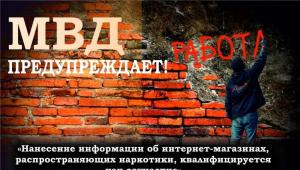 Надписи на стенах с предложениями приобрести наркотические и психотропные вещества через сайт или телеграм-аккаунт — один из способов рекламы сетевых наркошопов, через которые запрещенная к обороту отрава находит своего потребителя. Информация с контактами наносится возле учреждений образования, мест массового скопления молодежи, то есть там, где она может найти своего потребителя. На надписях, как правило, указывается аккаунт интернет-магазина по продаже наркотиков и психотропов. За свою работу так называемый трафаретчик (лицо, которое наносит надписи с помощью трафарета и баллончика с краской) получает вознаграждение, исходя из количества подтвержденных надписей. Кроме рекламы наркошопа, в содержании надписей может фигурировать и предложение о работе с упоминанием поражающих воображение зарплат (к примеру, несколько тысяч долларов в неделю, опыт и специальность не требуются).