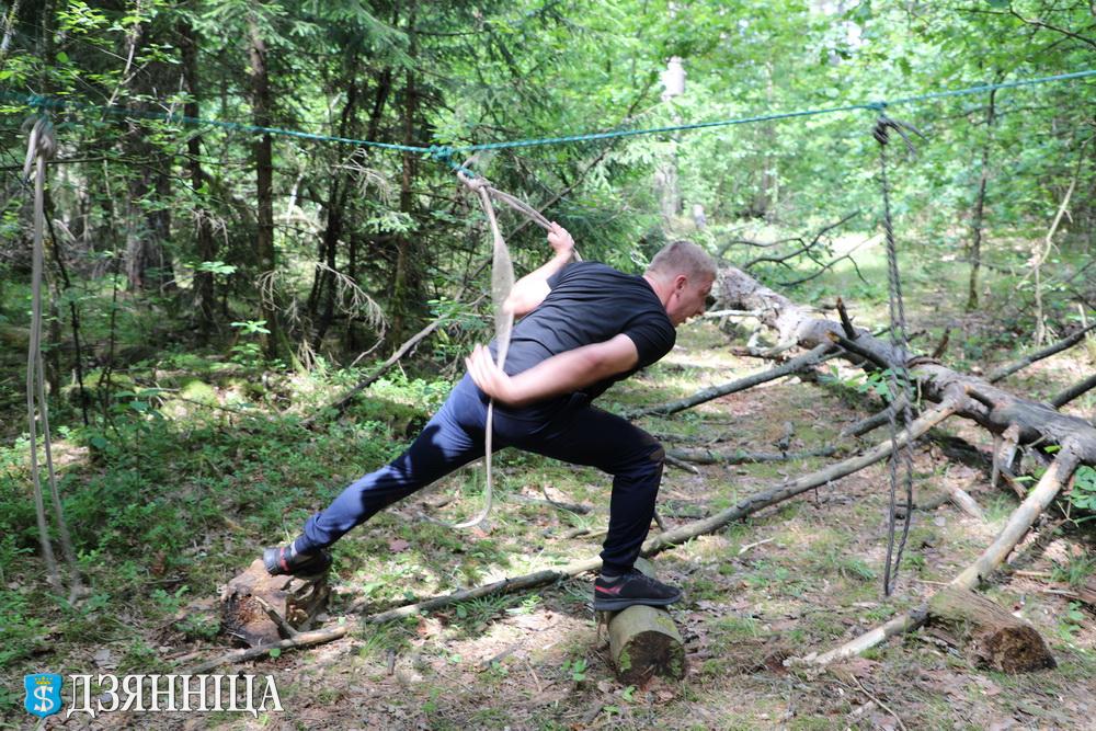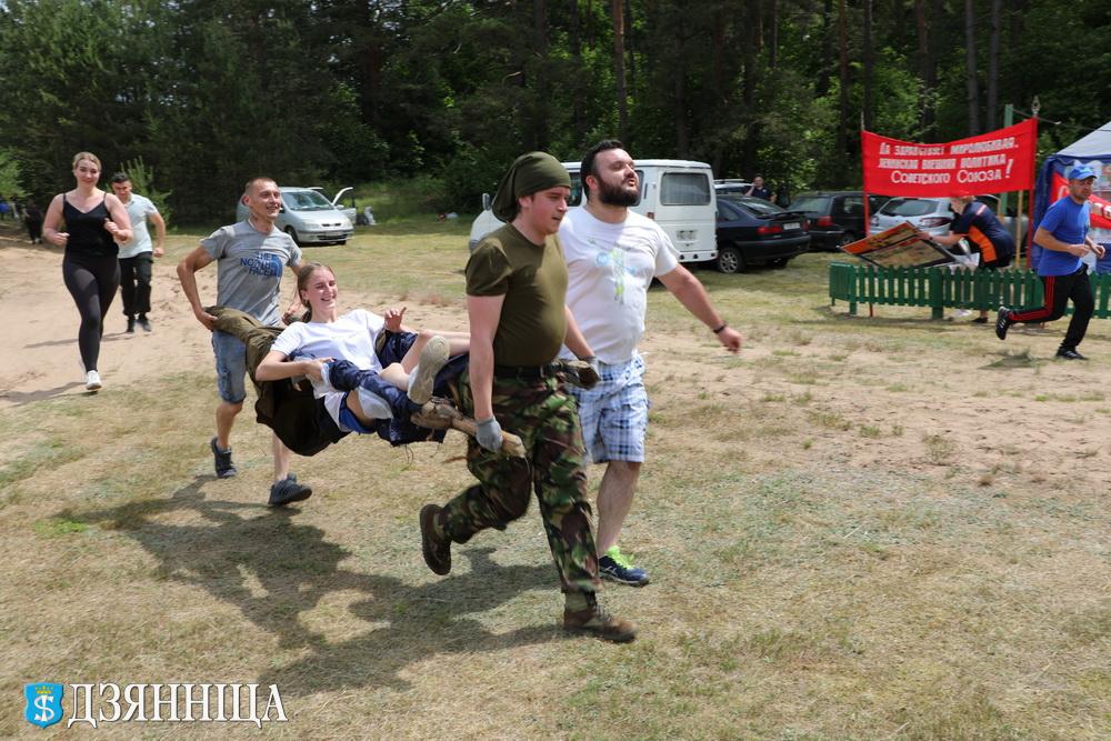 И вот был дан старт соревнованиям. За победу боролись восемь команд. Первым конкурсом в программе была туристическая полоса препятствий. В этом году судьи увеличили её дистанцию до километра и добавили новые этапы, что вызвало большой интерес. Участники ставили на время палатку, проходили по натянутой веревке и бревну, прыгали по кочкам, преодолевали гать и бурелом, проскальзывали через мышеловку и тоннель, ориентировались по азимуту и транспортировали пострадавшего на носилках. Быстрее всех и с наименьшим количеством штрафных балов полосу препятствий преодолели спортсмены Рожанковского сельского совета.