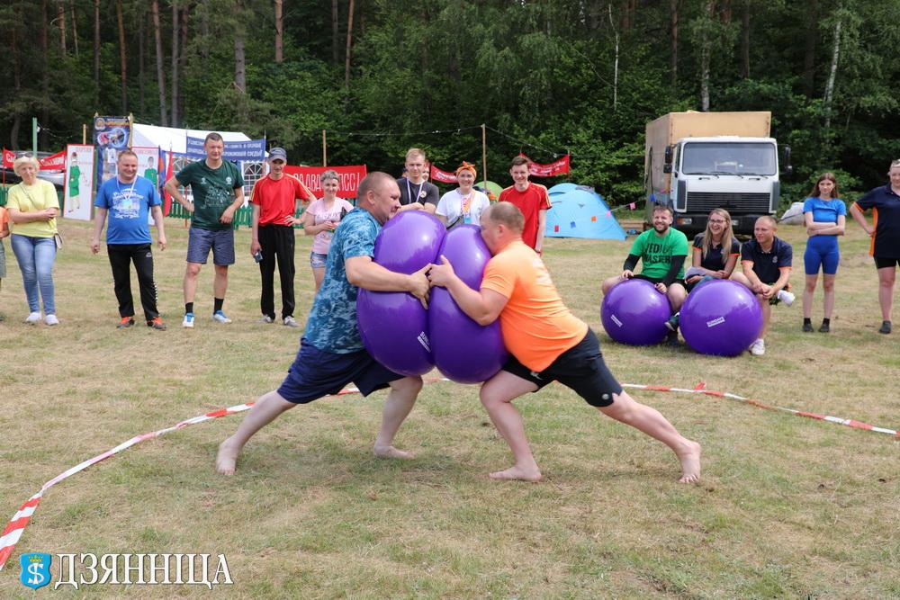 В программе праздника были и ноу-хау. Богатыри при помощи гимнастических шаров пытались вытолкать друг друга га пределы круга. Болельщики не жалели своих эмоций, подбадривая спортсменов. Каждый поединок оканчивался бурными аплодисментами. Самыми стойкими оказались спортсмены РУП ЖКХ.
