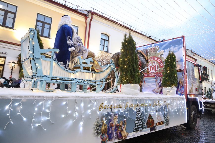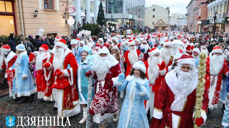 Шестьсот Дедов Морозов и Снегурочек, мобильное шоу барабанщиков, духовой оркестр в новогодних нарядах, "сказки на колесах" - большие авто с инсталляциями сюжетов новогодних волшебных историй. Так выглядели вечером центральные площади и связывающая их пешеходная улица Советская. Впереди этой поющей, играющей и танцующей колонны на сверкающем огнями автомобиле ехал главный Дед Мороз, приветственно взмахивая руками гродненцам. Ему вторили многочисленные Деды Морозы и Снегурочки, которые дарили улыбки зрителям, хлопали в ладоши с ликующими детьми, для которых это было настоящим прикосновением к чуду, и угощали малышей конфетами.
