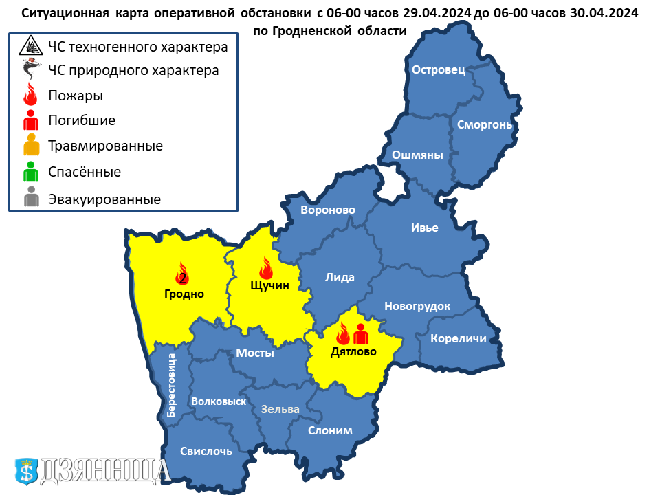 29.04.2024 в 19-12 поступило сообщение о пожаре жилого дома в д. Улановщина Дятловского района. В результате уничтожены кровля, перекрытие, имущество в доме, повреждены стены. Работниками МЧС обнаружен погибшим хозяин домовладения. Причина пожара устанавливается.