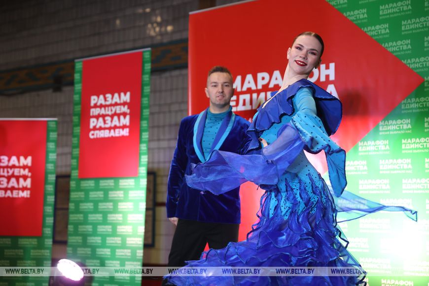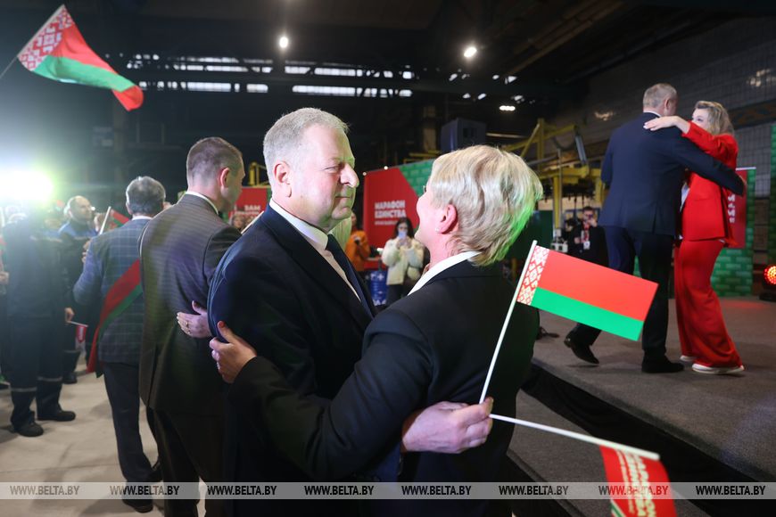 Флаги страны, флажки и баннеры "Марафона единства" украсили утром 17 января цех ОАО "Белкард". С концерта белорусских артистов начался первый день республиканской акции на предприятии. Гродненцев радовали выступлениями певица Влада, солистка Большого театра Марта Данусевич, Тарас Присяжнюк, группа "Бренд. Бай".