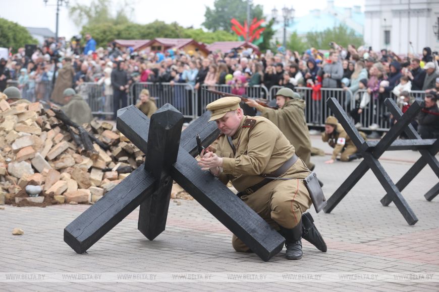 "В преддверии дня Великой Победы мы попробовали воссоздать реконструкцию боя за Рейхстаг, последнюю ключевую битву в Великой Отечественной войне, ту точку, которая поставит окончательное решение вопроса над нацизмом и фашизмом. Мы преклоняемся перед памятью воевавших в этой войне за наше с вами освобождение, за наше с вами право жить, перед нашими ветеранами, узниками концлагерей, которые сегодня здесь с нами на площади", - сказал председатель Гродненского облисполкома Юрий Караев. Глава региона выразил благодарность войскам Западного оперативного командования, военно-историческому клубу "Честь мундира" и лично его руководителю, всем тем, благодаря кому стала возможной реконструкция.