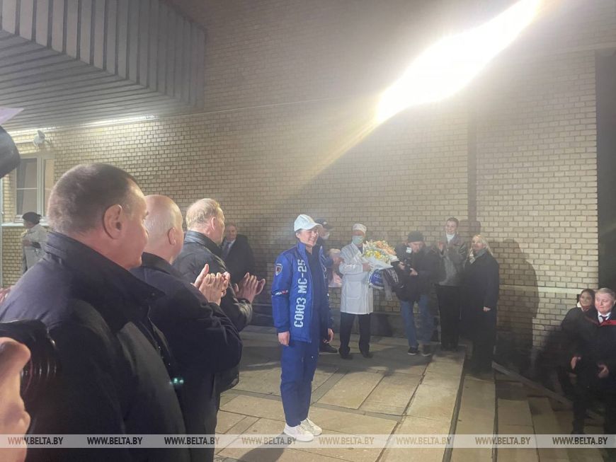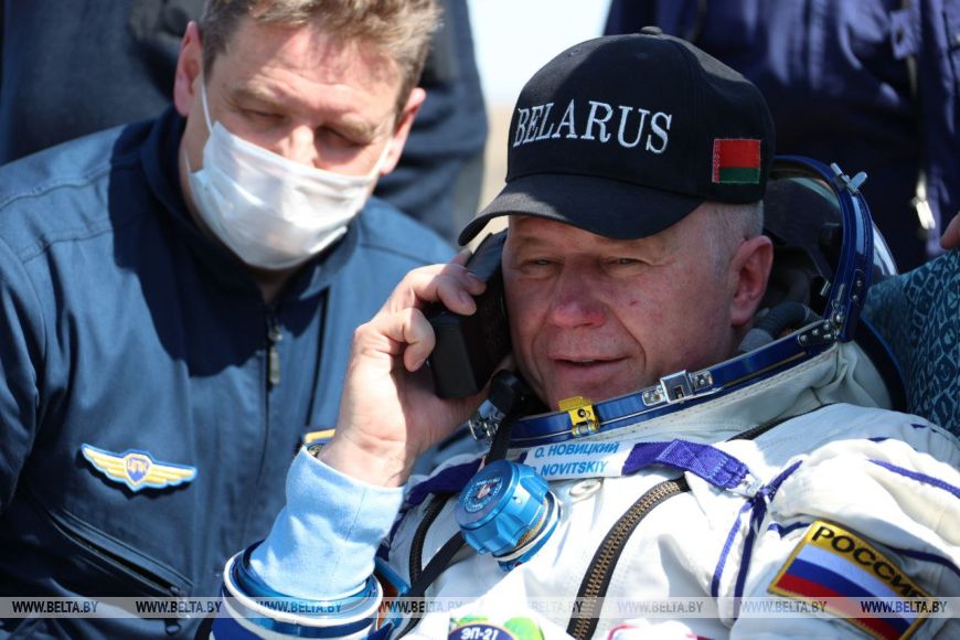Космонавтов перенесли и усадили на кресла, экипаж начали осматривать врачи, измерять пульс и давление. Тут же у Марины Василевской в руках оказался флаг Беларуси. Примечательно, что Олег Новицкий был с белорусским флагом: его изображение красовалось на кепке космонавта, тогда как на рукаве скафандра была нашивка с флагом России.