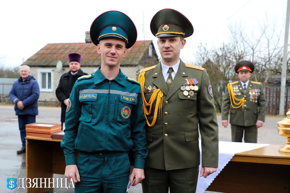 После окончания церемонии вручения наград, благочинный Щучинского церковного округа иерей Александр Пастерняк и ксендз прихода Святой Терезы Авильской Андрей Агель по традиции окропили святой водой новую пожарную автоцистерну и сотрудников, благословив на работу без происшествий.