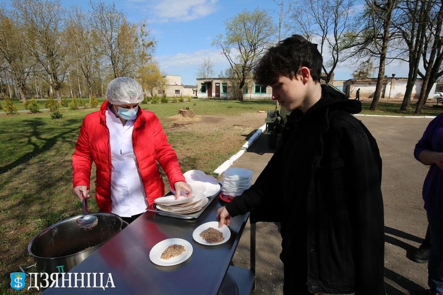 Закончился субботник совместным обедом на свежем воздухе. Здесь работала полевая кухня, а меню включало солдатскую кашу и горячий ароматный чай.