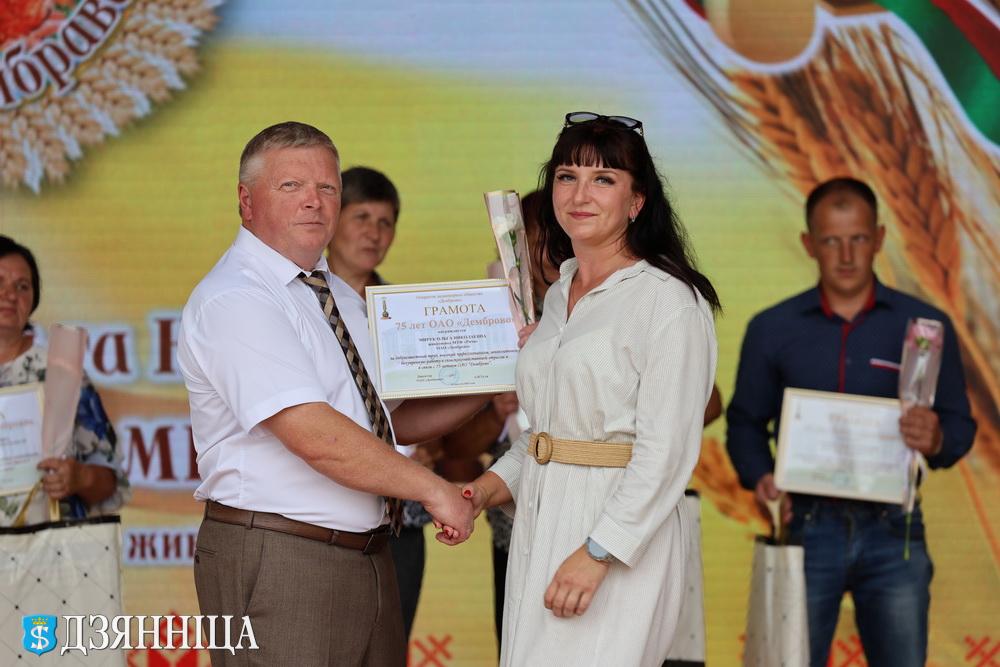 Церемонию награждения продолжил Александр Туля. За вклад в весомый каравай Щучинщины юбилейными медалями «75 лет ОАО «Демброво», грамотами и денежными премиями были награждены лучшие комбайнеры, водители, операторы зерносушильных комплексов, специалисты и бригадиры производственных бригад в растениеводстве. В этот день на сцену для награждения приглашались ветераны сельхозпредприятия и молодые специалисты. Заслуженные награды были вручены лучшим труженикам хозяйства, кто добросовестно выполняет свои трудовые обязанности, укрепляя экономический фундамент сельхозпредприятия.