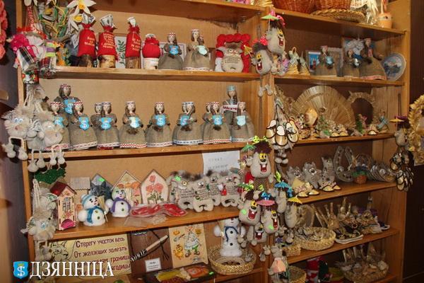 На паліцах – гатовыя да продажу вырабы. Вясёлыя сабакі і каты, лялькі-беларусачкі, дрэвы з бісеру, снежныя бабы з тканіны і елачкі з нітак, падушкі і куфэрачкі… Прыгажосць!