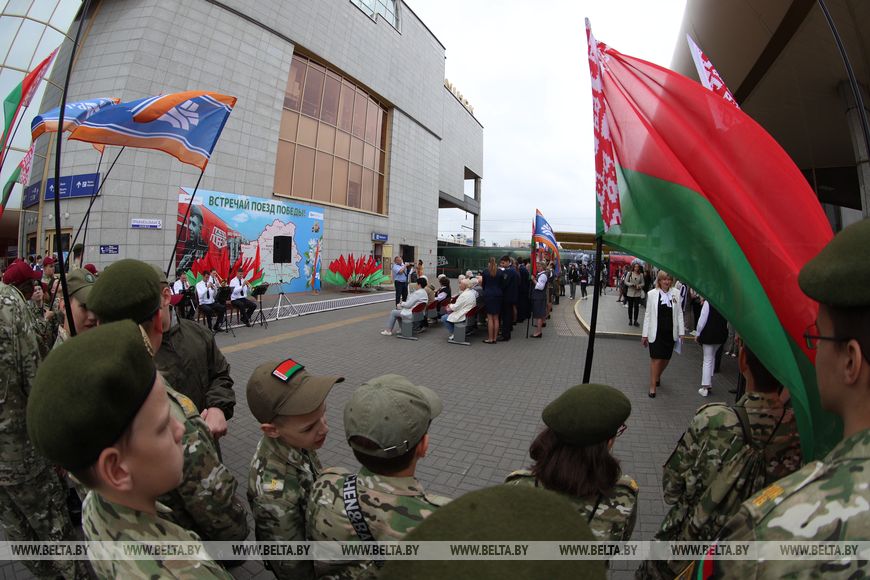 Встретили "Поезд Победы" торжественно. Прошел митинг, посвященный началу демонстрации экспозиции в столице. Перед гостями выступили духовой оркестр ГУВД Мингорисполкома, творческие коллективы и артисты любительского художественного творчества Культурно-спортивного центра Минского отделения Белорусской железной дороги, воспитанники Детской железной дороги им. К.С. Заслонова.