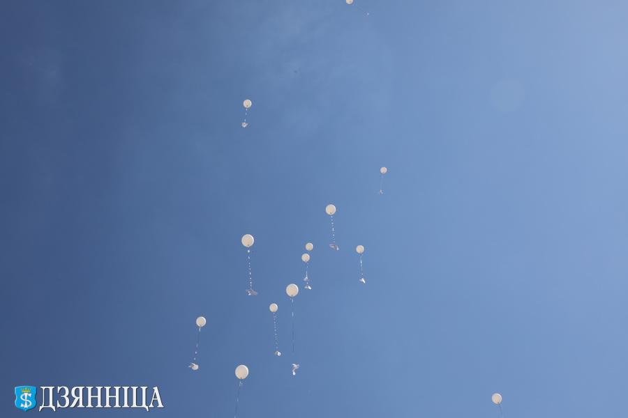 Участники траурного митинга возложили цветы к памятнику Каминским и отпустили в небо бумажных голубей, прикреплённых к воздушным шарам, как символ мира, добра и любви.