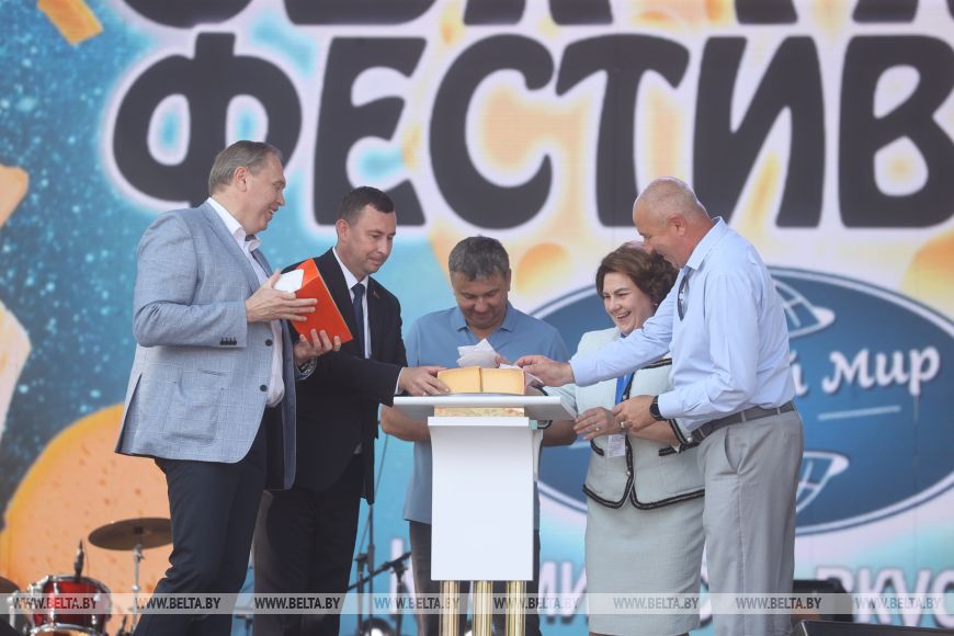 Почетные гости фестиваля - Владимир Караник, Юрий Шулейко, помощник Президента- инспектор по Гродненской области Юрий Караев, председатель Гродненского горисполкома Андрей Хмель и генеральный директор ОАО "Молочный Мир " Марина Аникеева - торжественно разрезали головку нового гродненского сыра и дали старт фестивалю.