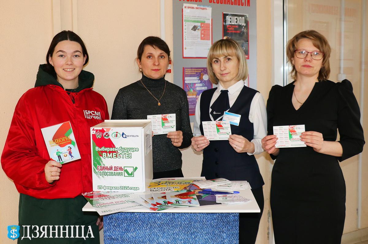 – Наша цель – напомнить избирателям о предстоящих выборах депутатов всех уровней в единый день голосования, который пройдёт 25 февраля, – говорит первый секретарь Щучинского РК ОО "БРСМ" Виталия Лелявко. – Мы также предлагаем щучинцам и гостям города напомнить другу, коллеге, близкому человеку о важности события и личном участии в выборах, направив ему почтовую карточку-приглашение «Выбираем будущее вместе!». Для этого необходимо заполнить графы почтовой карточки «Кому-Куда» и поместить в стилизованный почтовый ящик. Затем все заполненные почтовые отправления будут отправлены адресатам.