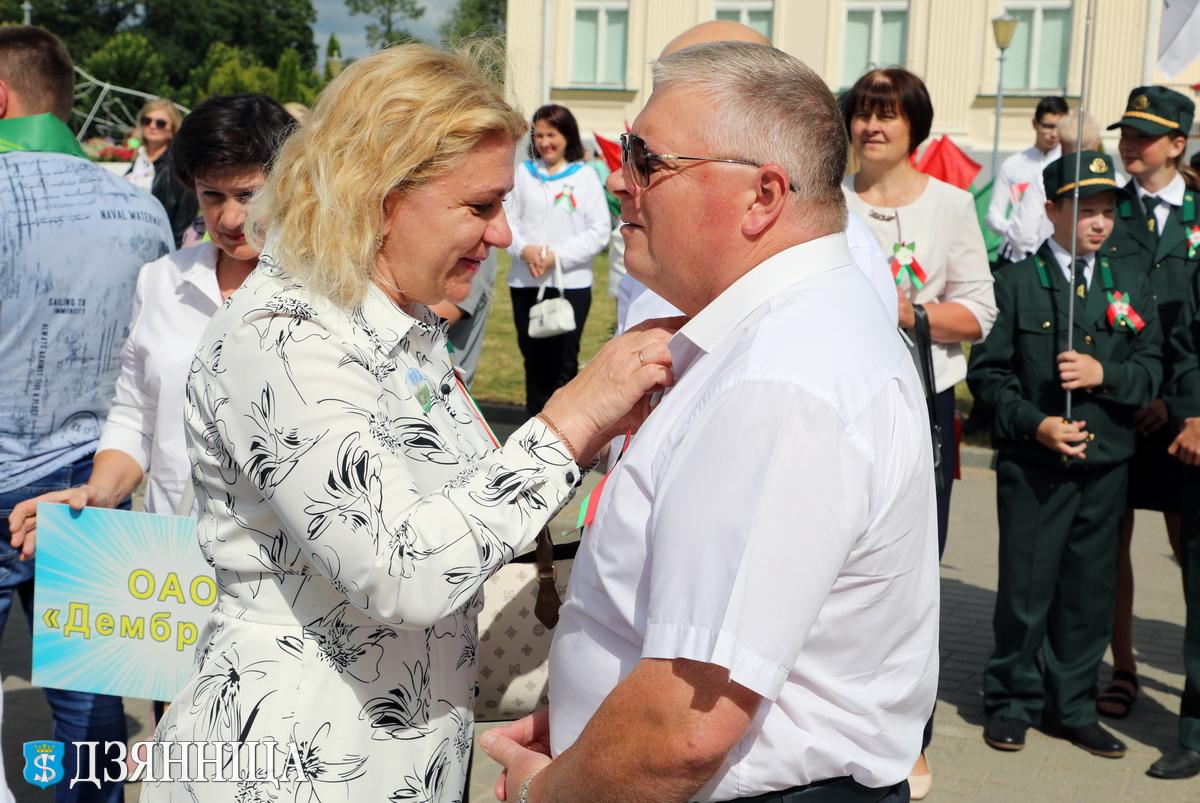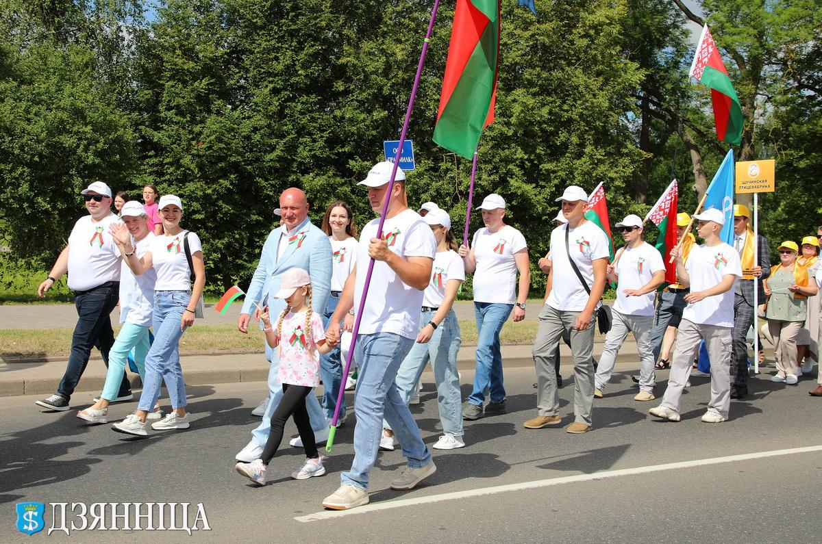 Представители трудовых коллективов района с табличками с названием организаций в брендированной одежде гордо несут белорусские флаги -- символ нашей суверенности. Славная страница в истории района -- деятельность сельскохозяйственных организаций, обеспечивающих своим трудом продовольственную безопасность. Торжественным маршем проходят представители общественных объединений, работники культуры в национальных костюмах, спортсмены в форменной одежде с растяжкой «Беларусь помнит» и многие другие.