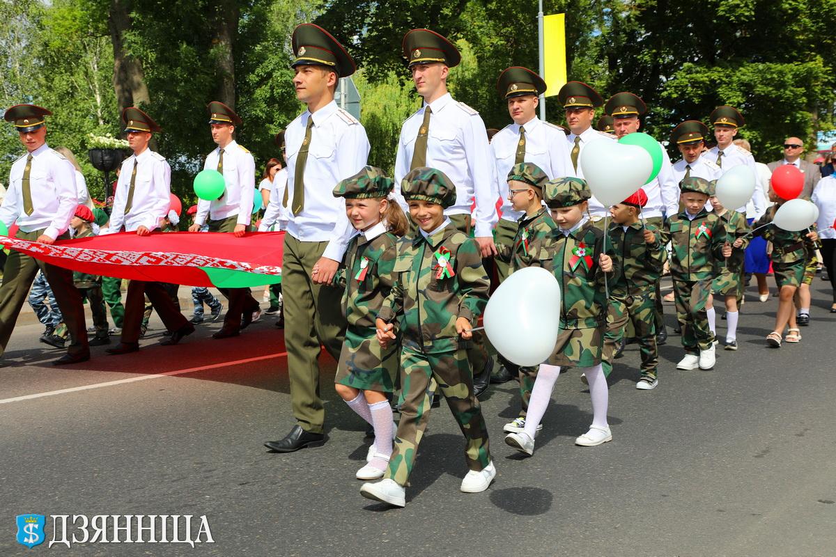 В праздничном шествии -- учащиеся из классов РОЧС, РОВД, военкомата, военно-патриотических классов, профклассов, образцовые коллективы системы образования, активисты БРСМ, члены молодежного парламента.